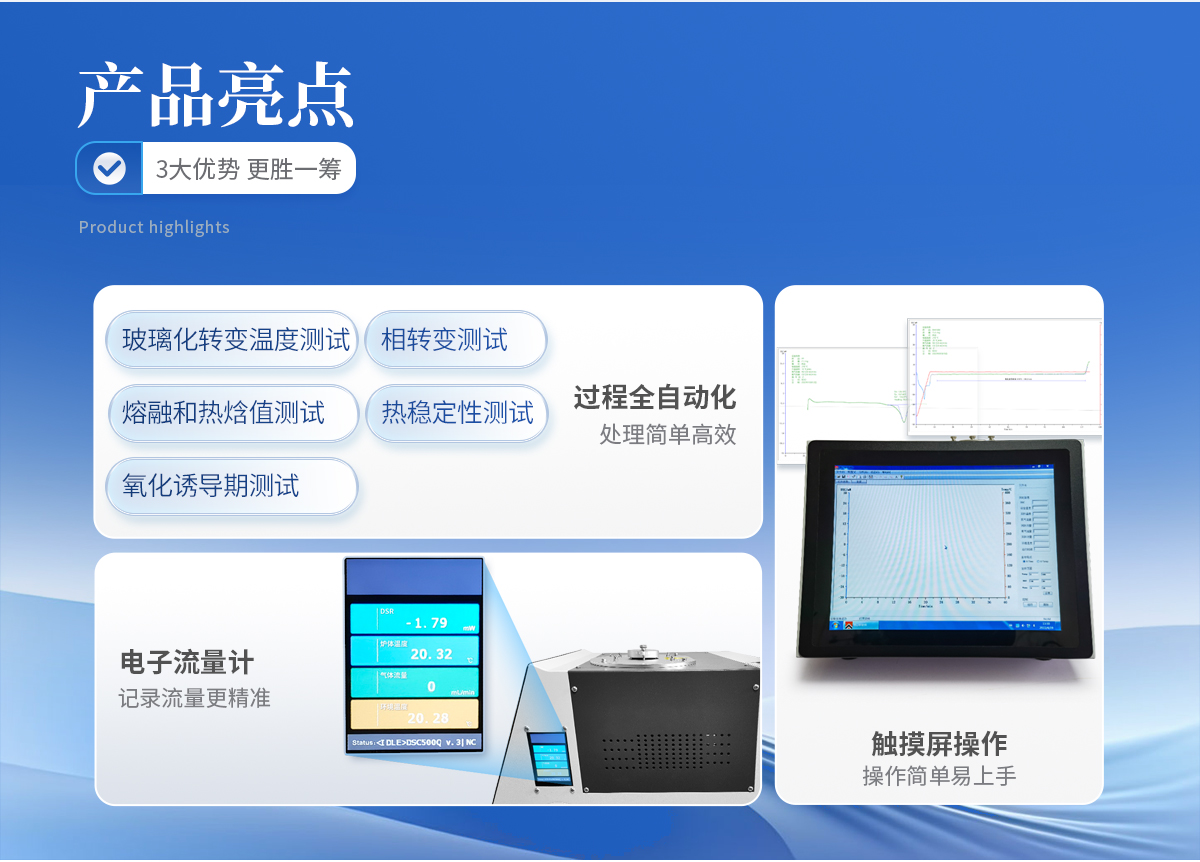 差示扫描量热仪为触摸屏式,可进行玻璃化转变温度测试、相转变测试、熔融和热焓 值测试、产品稳定性、氧化诱导期测试。