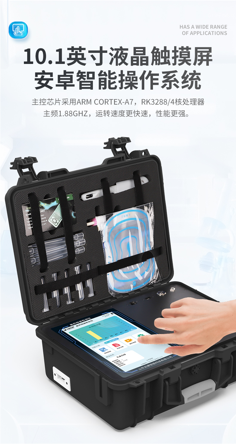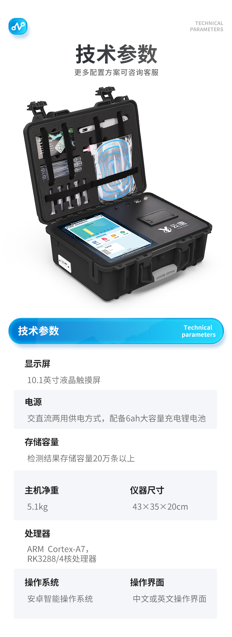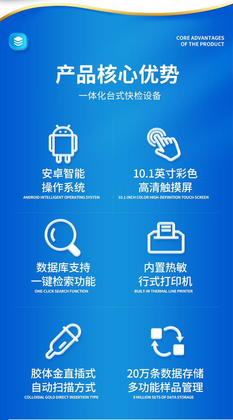 1、仪器采用10.1英寸液晶触摸屏显,搭配运行安卓智能操作系统,主控芯片采用ARM Cortex-A7,RK3288/4核处理器,主频1.88Ghz,运转速度更快速,性能更强。2、仪器功能包括:胶体金检测模块、数字化管理模块、无线通讯模块等,可以满足同一软件下实现所有检测项目的检测,并在同一窗口展示检测结果。3、一体化便携式快检设备,采用交直流两用供电方式,可连接车载电源,配备6ah大容量充电锂电池,可以满足现场及流动检测使用的需求。仪器尺寸:43×35×20cm,   主机净重:5.1kg4、系统自带数据集成模块,设备首页自动统计检测数据包含:周检测数据、月检测数据,全部检测总数量,均包含检测总数,合格数,不合格数,以及相关柱形分析图,对各项检测数据清晰掌握,无需电脑查询,更加快捷直观。5、仪器具有任务预设模块,可在样品送检前提前预设样品名称、检测指标、送检单位等信息,样品送检时一键调取保存信息,检测更加方便快捷。6、胶体金检测模块: