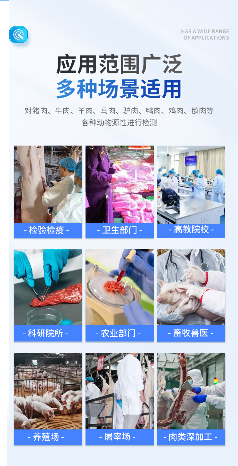 该仪器是一款**、便捷的食品检测设备,专为识别肉类的真假而设计。可以对猪肉、牛肉、羊肉、马肉、驴肉、鸭肉、鸡肉、鹅肉等各种动物源性进行检测。能够迅速、准确地检测肉类及肉源性种类,确保所食用的肉类真实可靠。检测迅速准确,为各检测单位提供专业的服务。