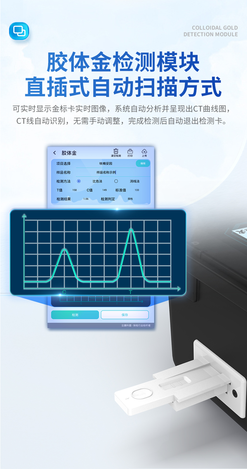轨道式自动传输扫描方式,可实时显示金标卡实时图像,系统自动分析并呈现出CT曲线图,CT线自动识别,无需手动调整,完成检测后自动退出检测卡。