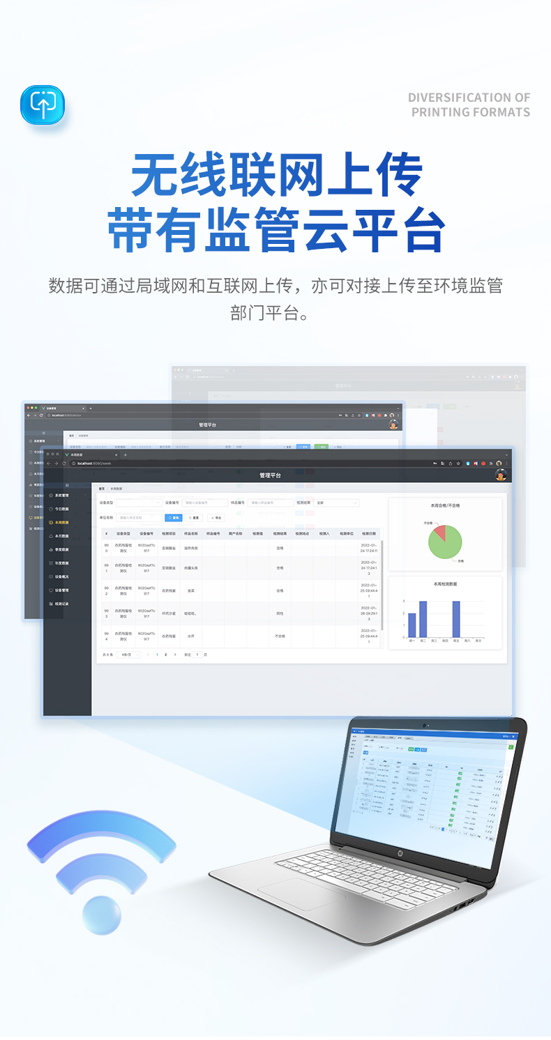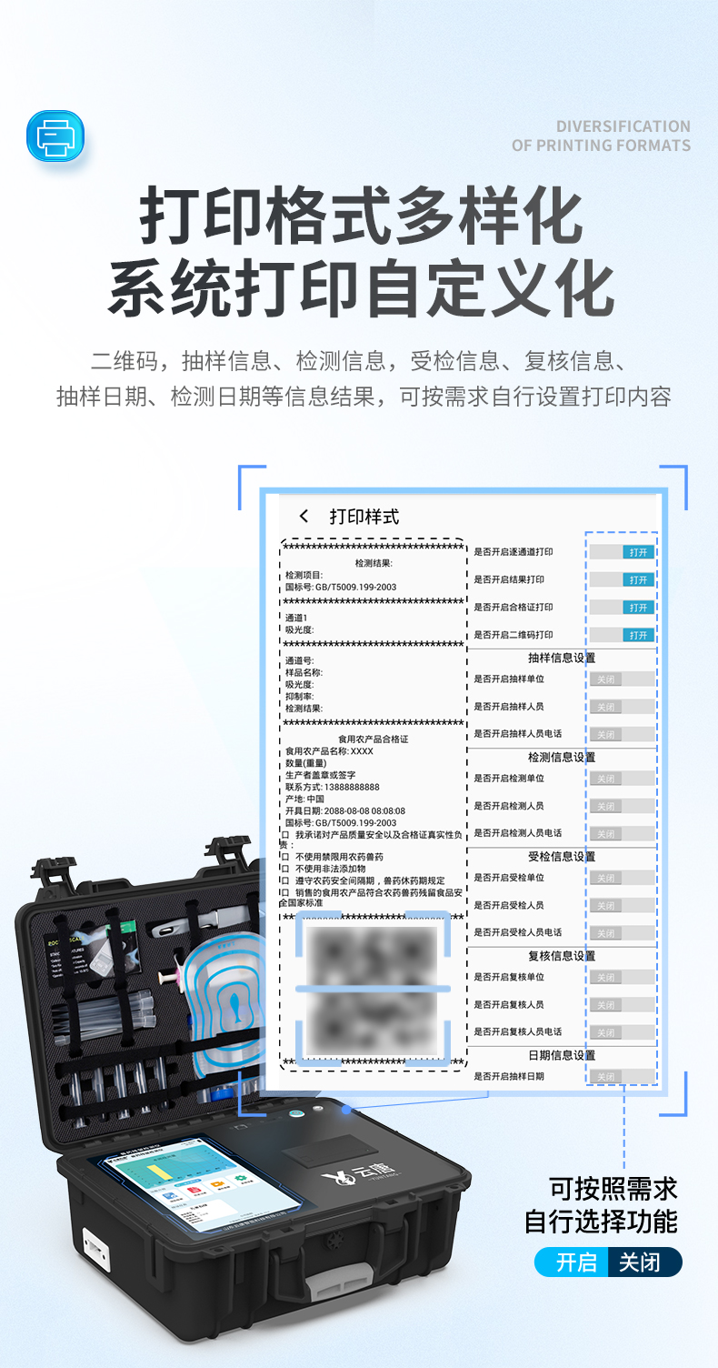 7、图像调整功能:可根据金标卡读取图像进行多方位调整,使其更精准读取结果。8、仪器检测系统拥有庞大数据库,并且构建了完善的检索、修订功能。食品库涵盖多种样品名称,可按需添加或删除、编辑样品名称;产品数据库以及历史检测记录支持一键检索功能。9、系统打印自定义化,打印格式多样化,产品合格证(国家标准要求),二维码,抽样信息、检测信息,受检信息、复核信息、抽样日期、检测日期等信息结果,可按需求自行设置打印内容。10、A4纸版本报告打印功能:设备拥有两种结果展示方式,可以自动生成A4打印模板和小票打印模板两种样式,可通过WiFi及网线等方式链接外置打印机可进行打印11、仪器具有 wifi 联网上传、RJ45网线连接功能,可以快速上传数据。同步对接监管平台,数据可局域网和互联网数据上传,检测结果直接传至食品安全监管平台。进行区域食品安全监管及大数据分析处理与数据统计,检测区域食品安全长短期动态,达到食品安全问题预估、预警。12、设备支持U盘存储,标准USB接口,免驱动安装。检测结果存储容量20万条以上,可生成Excel表格,进行一键拷贝,并具有登录保护功能,可设置用户名及密码,规范不同人员操作权限,防止非工作人员操作,并且可以进行重新校准、锁定、恢复出厂设置功能。仪器固件可升级,后期检测项目可扩充。13、仪器具备远程升级功能,可定向分客户分仪器更新,开机后自动更新,并可持续性免费更新系统版本,无需像传统产品返厂更新,节省时间及人力成本并避免了物流运输返厂升级导致设备损坏的潜在风险。