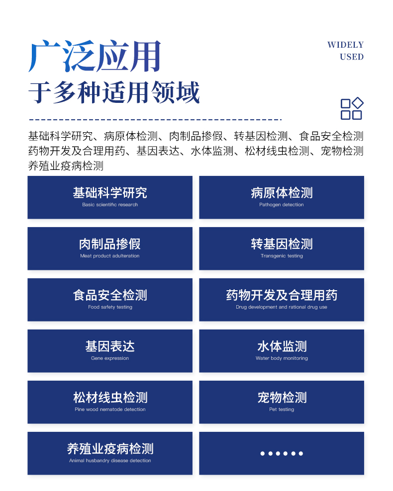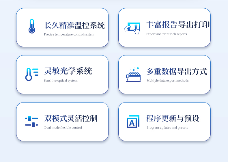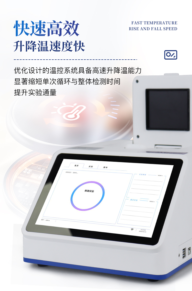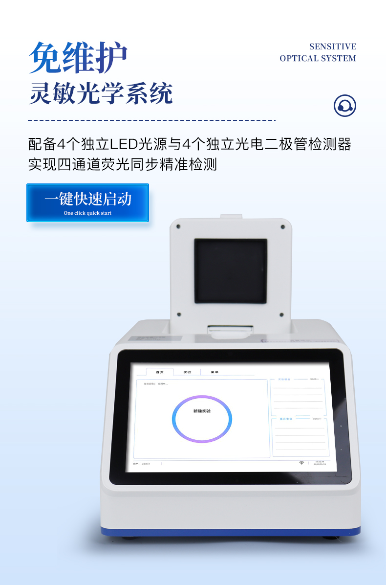 | 1.智能操作系统,实验尽在掌握 | A程序更新与预设:支持在线更新实验程序,并内置丰富的预设实验程序模板,用户亦可自定义保存常用模版,实现一键快速启动,极大提升操作效率。 | B极简启动体验(可选配):可定制集成摄像头扫描系统,用户只需扫描样品板或程序卡的二维码,即可自动识别并调用对应实验程序,简化流程,避免人为设置错误。 | C操作简单:触摸屏界面设计得直观易懂,新用户也能快速上手。预置常用程序模板,进一步简化操作流程。 | 2.精准稳定的温控与光学核心 | A长久精准的温控系统:采用进口***TEC半导体制冷模块,控温精准(±0.1°C),孔间温度均匀性**(≤±0.3°C)。系统稳定性卓越,长期使用性能衰减小,校准周期长达数年,显著降低维护成本与运营中断。 | B免维护的灵敏光学系统:配备4个独立LED光源与4个独立光电二极管检测器,实现四通道荧光同步精准检测。采用超长寿命进口光源,设计寿命期内免维护,无需额外校准或更换,保障检测结果长期一致性与高灵敏度。 | C卓越的数据质量:实验线性相关性高(R²≥0.999),重复性优异(孔间CV值低),确保定量结果准确可靠,数据置信度高 | 3.**便捷的数据与输出管理 | A多重数据导出方式:支持通过USB存储设备直接拷贝,或经由Wi-Fi无线网络传输数据至本地服务器或云端,方便灵活,满足各类实验室数据管理习惯。 | B丰富的报告导出与打印:支持生成并导出多种格式(如PDF、Excel)的实验报告。仪器兼容USB热敏打印机、蓝牙无线打印机及常规A4打印机,可直接在仪器上或通过电脑一键导出并打印专业报告,便于结果存档与即时分享。 | 4.快速**与坚固耐用 | A升降温速度快:优化设计的温控系统具备高速升降温能力,显著缩短单次循环与整体检测时间,提升实验通量。 | B超长使用寿命:核心部件均选用工业级耐用材料与设计,整机运行稳定可靠,致力于为用户提供长久的投资回报。 |