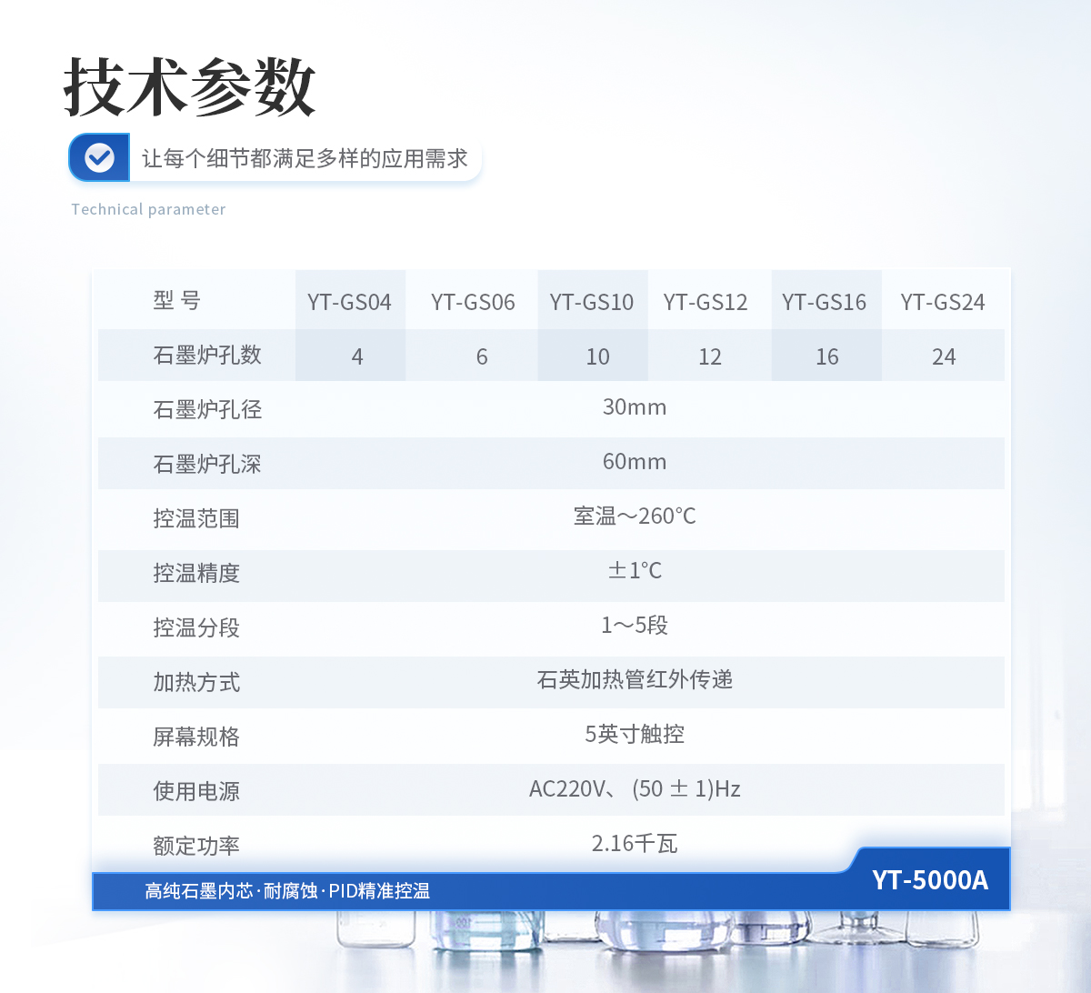 石墨炉孔:孔径30mm,孔深60mm,孔数2×2 控温范围:室温~260℃ 控温精度:±1℃ 控温分段:1~5段 加热方式:石英加热管红外传递 屏幕规格:5寸触控 主机外型尺寸:宽387mm×深371mm×高168mm 使用电源:AC220V、 (50 ± 1)Hz 额定功率:1千瓦