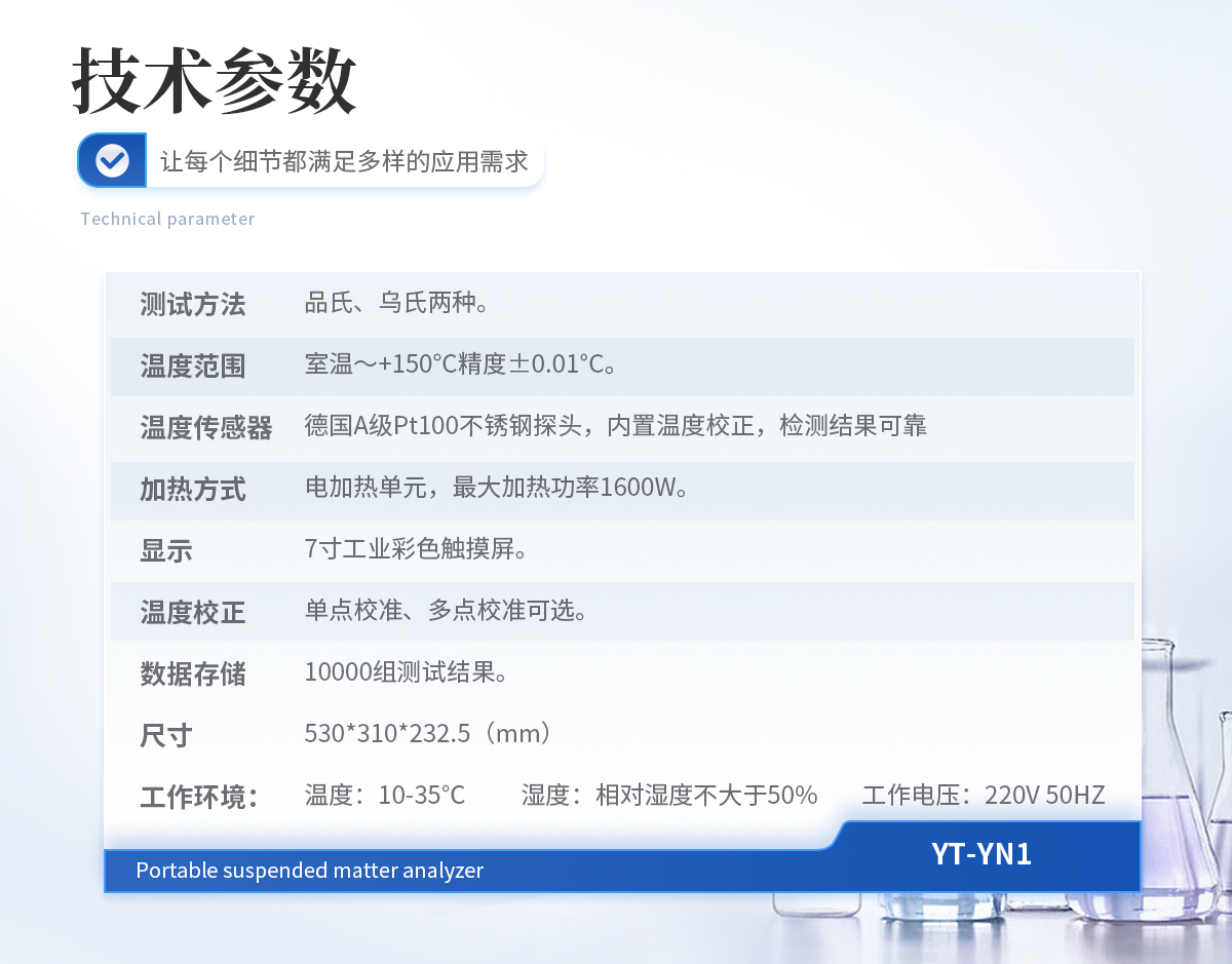 测试方法:品氏、乌氏两种。 温度范围:室温~+150°C精度±0.01°C。 温度传感器:德国A级Pt100不锈钢探头,内置温度校正,检测结果可靠。 加热方式:电加热单元,**加热功率1600W。 显示:7寸工业彩色触摸屏。 温度校正:单点校准、多点校准可选。 数据存储:10000组测试结果。 尺寸:530*310*232.5(mm) 工作环境: 温 度:10-35℃ 湿 度:相对湿度不大于50% 工作电压:220V 50HZ