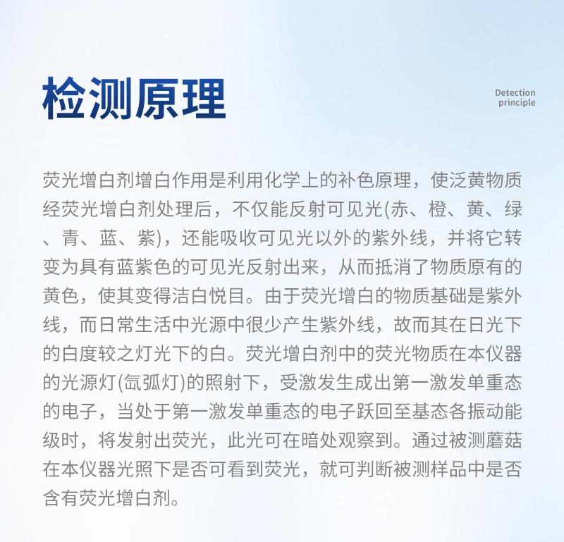 | 荧光增白剂增白作用是利用化学上的补色原理,使泛黄物质经荧光增白剂处理后,不仅能反射可见光(赤、橙、黄、绿、青、蓝、紫),还能吸收可见光以外的紫外线,并将它转变为具有蓝紫色的可见光反射出来,从而抵消了物质原有的黄色,使其变得洁白悦目。由于荧光增白的物质基础是紫外线,而日常生活中光源中很少产生紫外线,故而其在日光下的白度较之灯光下的白。荧光增白剂中的荧光物质在本仪器的光源灯(氙弧灯)的照射下,受激发生成出第一激发单重态的电子,当处于第一激发单重态的电子跃回至基态各振动能级时,将发射出荧光,此光可在暗处观察到。通过被测蘑菇在本仪器光照下是否可看到荧光,就可判断被测样品中是否含有荧光增白剂。 |