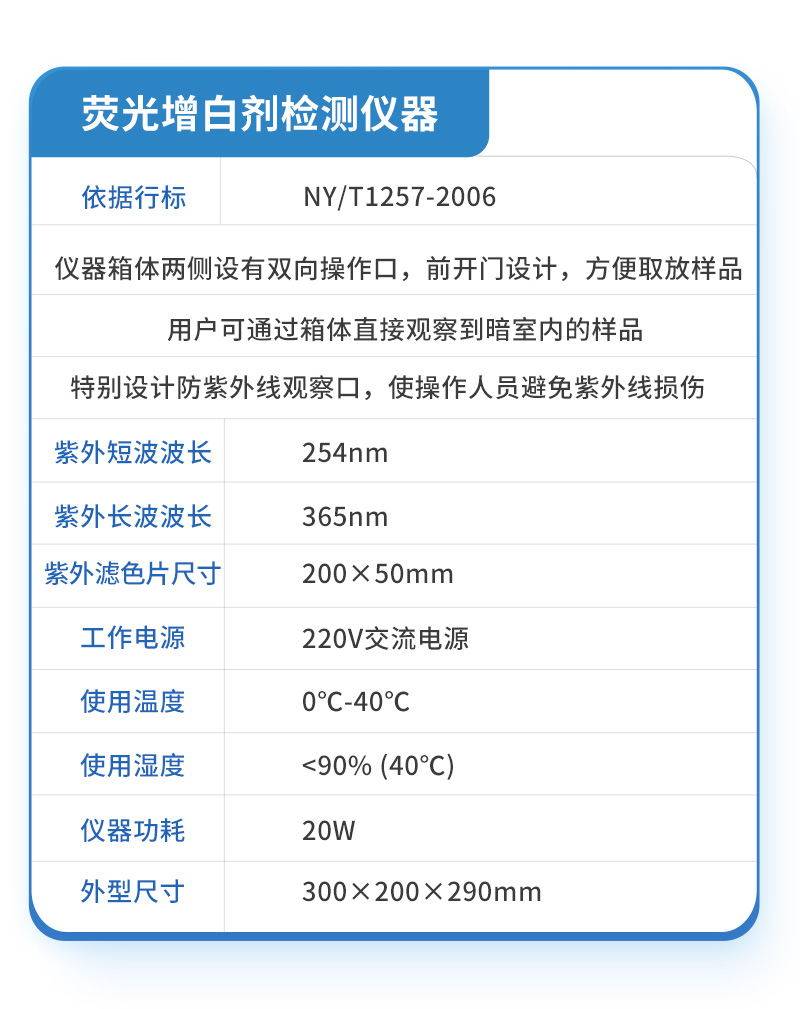 | ★依据行标:NY/T1257-2006 | ★仪器箱体两侧设有双向操作口,前开门设计,方便取放样品。 | ★用户可通过箱体直接观察到暗室内的样品。 | ★特别设计防紫外线观察口,使操作人员避免紫外线损伤。 | ★紫外短波波长:254nm | ★紫外长波波长:365nm | ★可见光源 | ★紫外滤色片尺寸:200×50mm | ★工作电源: 220V交流电源 | ★使用温度: 0℃-40℃ | ★使用湿度:<90% (40℃) | ★仪器功耗: 20W | ★外型尺寸:300×200×290mm |