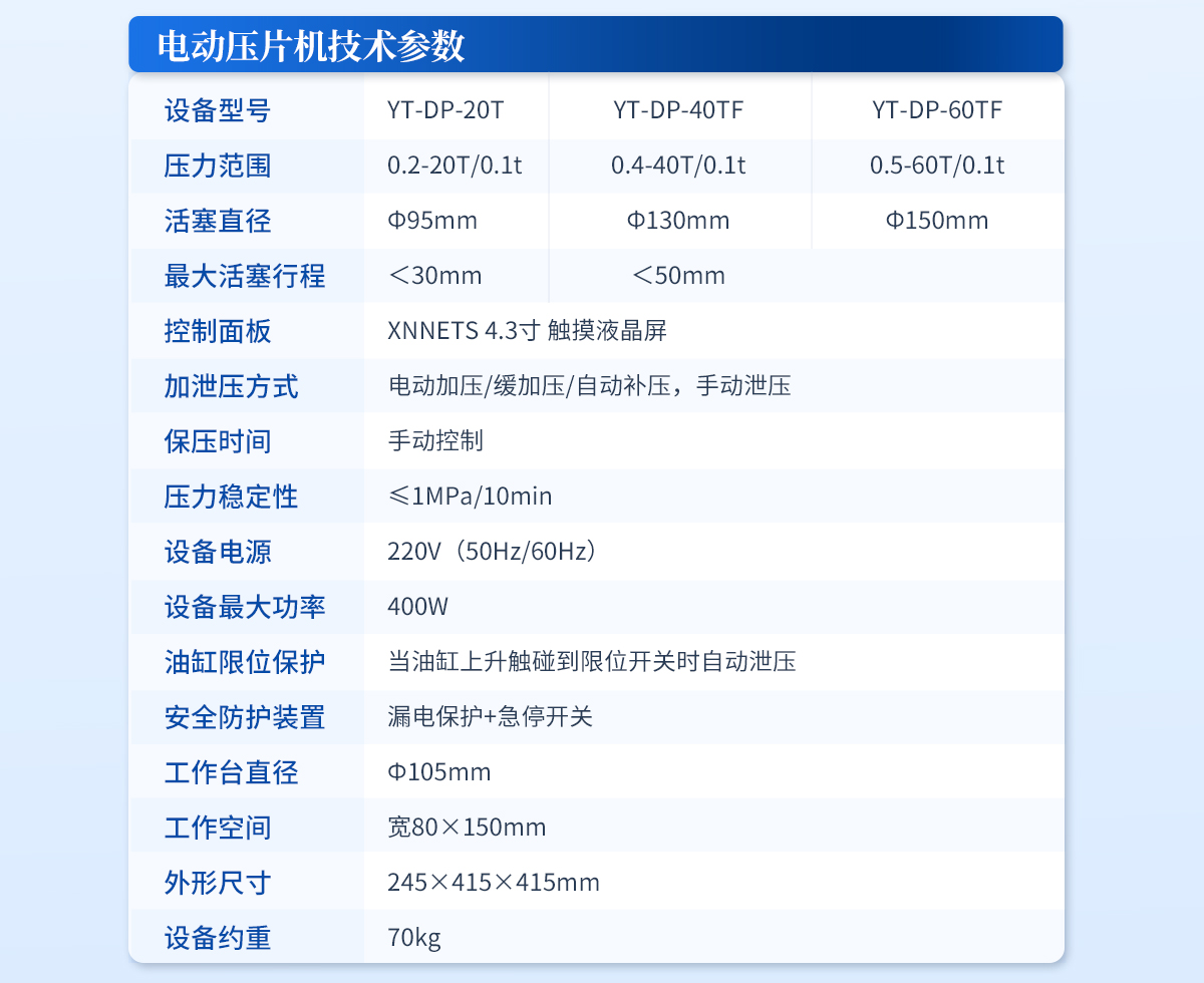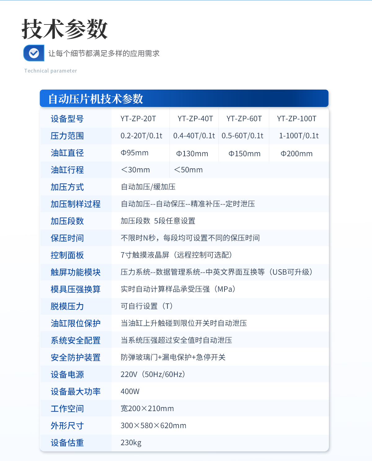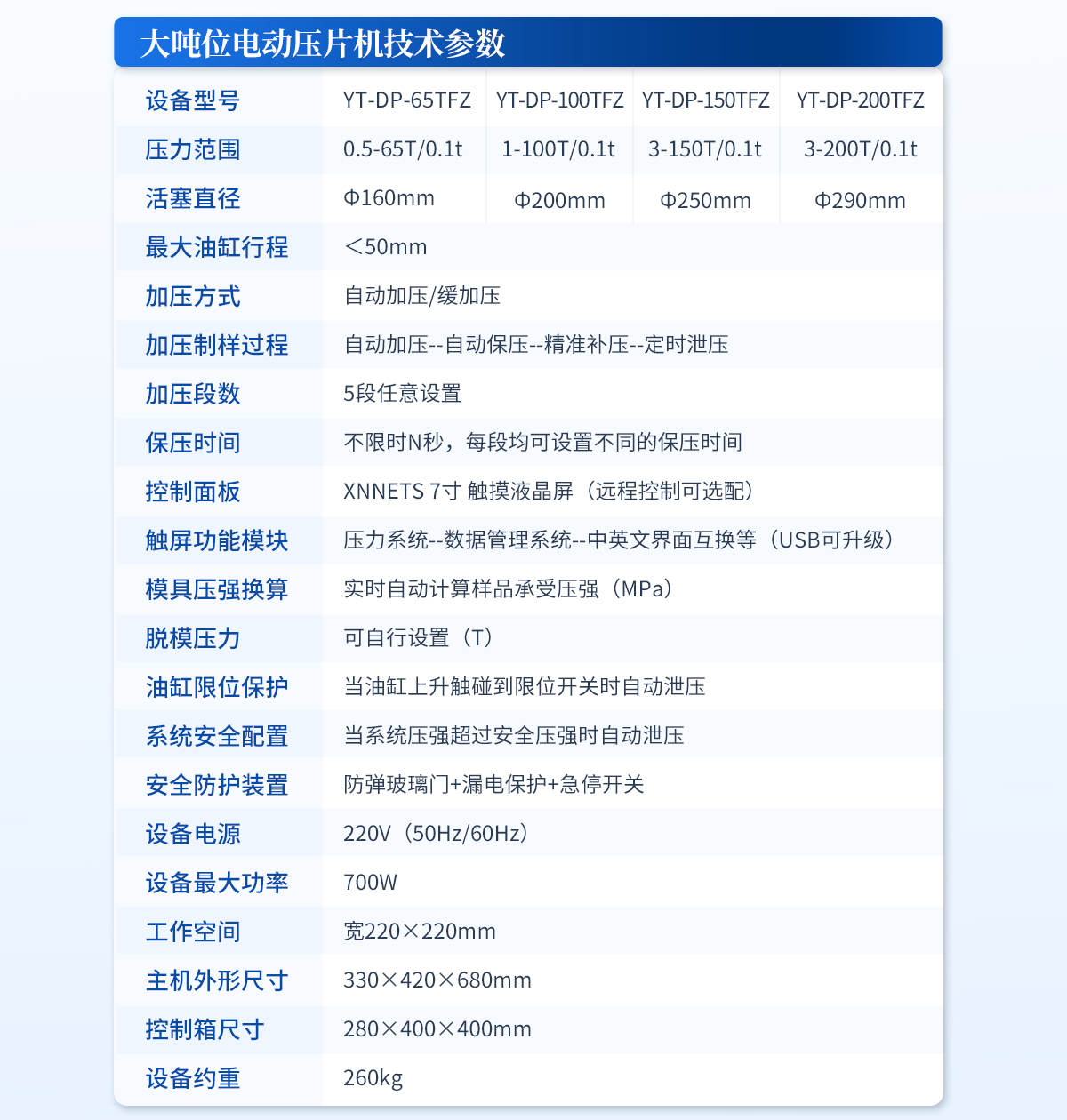 产品概述:该机的优势是压力大、空间大,可操作性强,采用分体式结构,7寸触摸液晶屏,自动化程序波段控制,操作界面可中英文互换,主要用于大规格模具在大压力下的样品制备;全系标配防弹玻璃防护罩,操作生产安全又放心。技术参数:设备型号:YT-DP-65TFZ压力范围:0.5-65T/0.1t油缸直径:Φ160mm油缸行程:<50mm加压方式:自