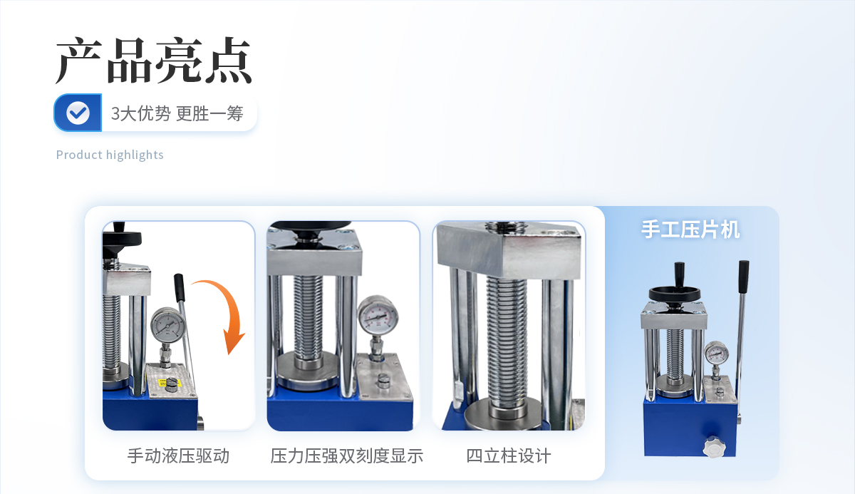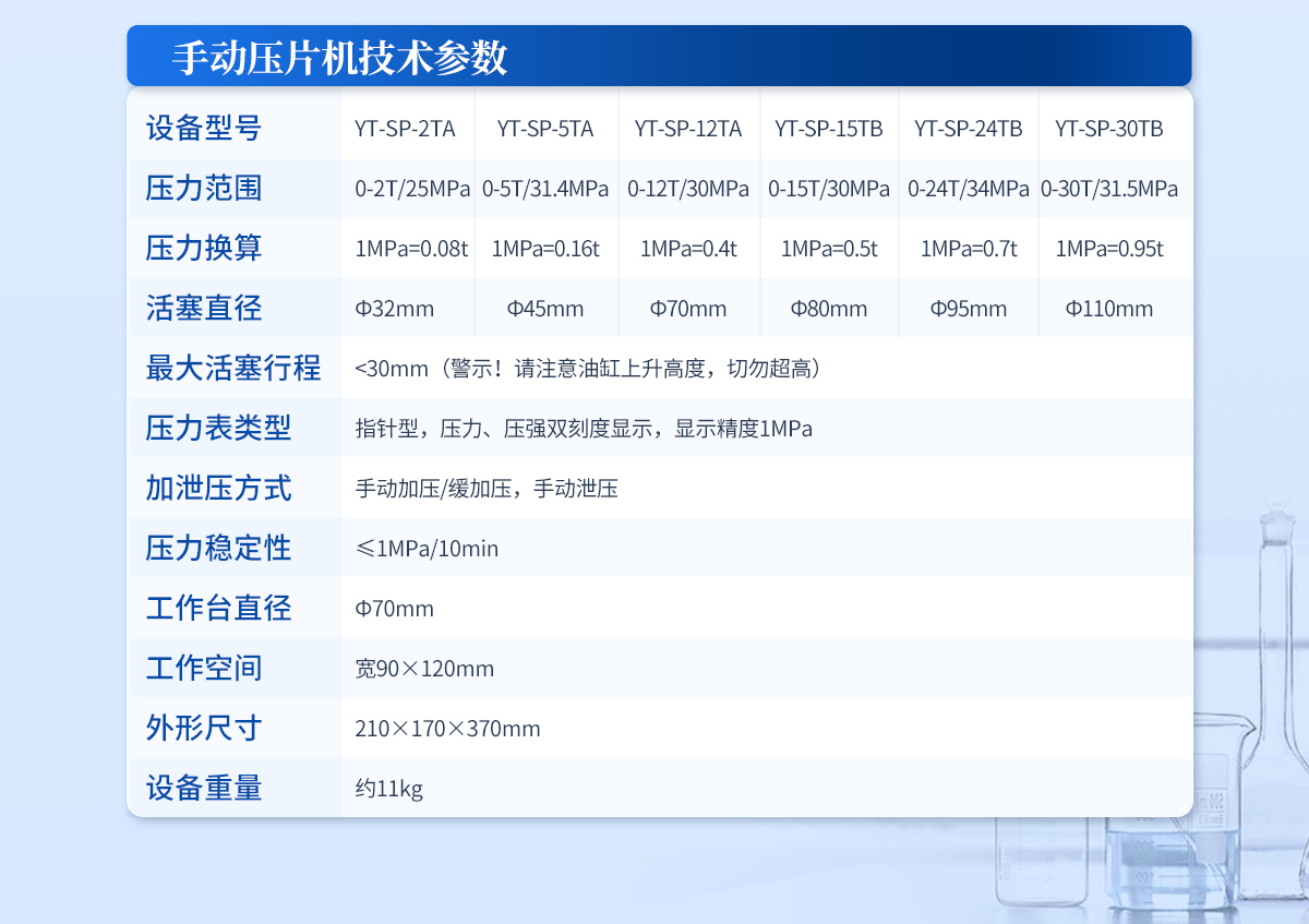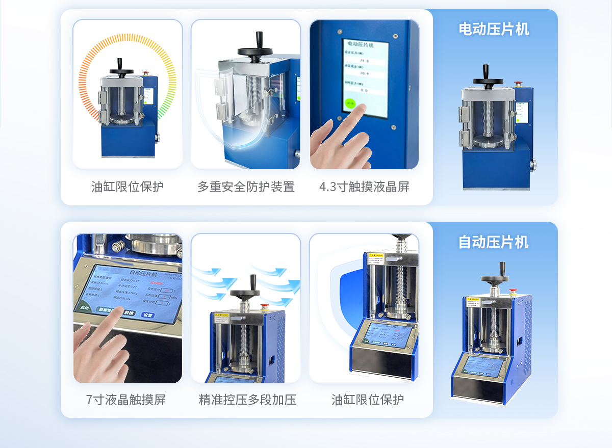 产品概述:该机的优势是压力大、空间大,可操作性强,采用分体式结构,7寸触摸液晶屏,自动化程序波段控制,操作界面可中英文互换,主要用于大规格模具在大压力下的样品制备;全系标配防弹玻璃防护罩,操作生产安全又放心。技术参数:设备型号:YT-DP-65TFZ压力范围:0.5-65T/0.1t油缸直径:Φ160mm油缸行程:<50mm加压方式:自